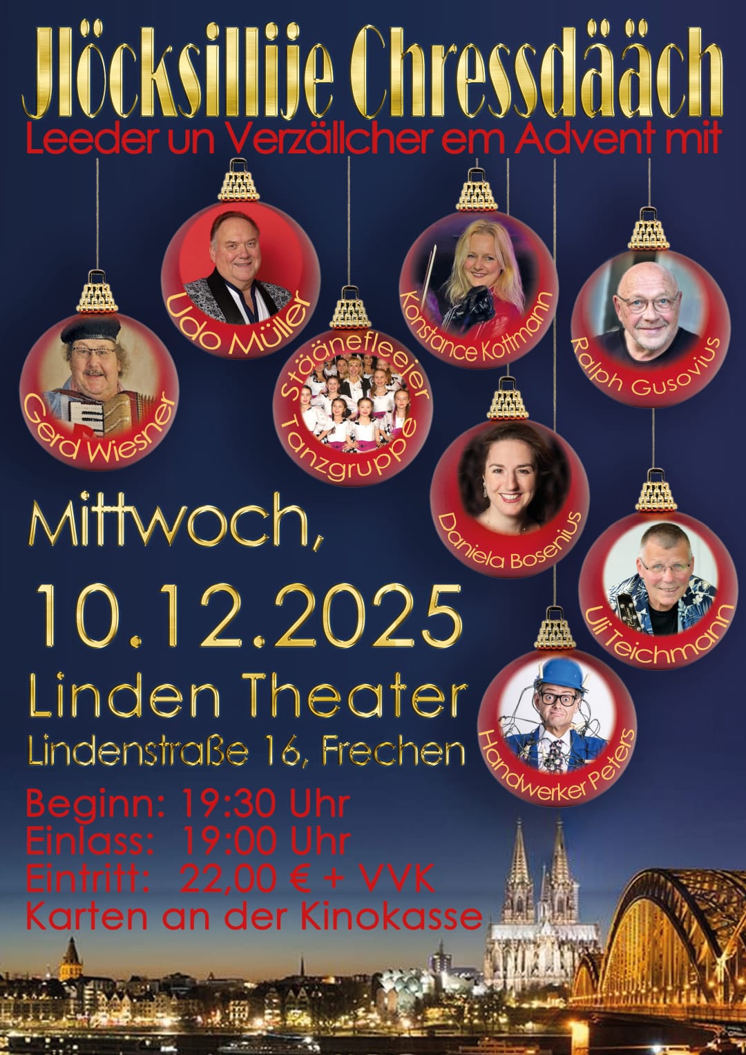 Richtig warm ums Herz wird es aber erst dann, wenn wir uns im Freundes- und Familienkreis Geschichten aus der „Guten alten Zeit“, aber auch aus dem „Hier und Jetzt“ erzählen, und dabei noch weihnachtliche Lieder singen. Am Besten noch in unserer Muttersprache: Op Kölsch! Dann laden wir Sie zu einer Kölsch-Klassischen Weihnacht ins Linden-Theater Frechen mit einem bunten Programm ein.